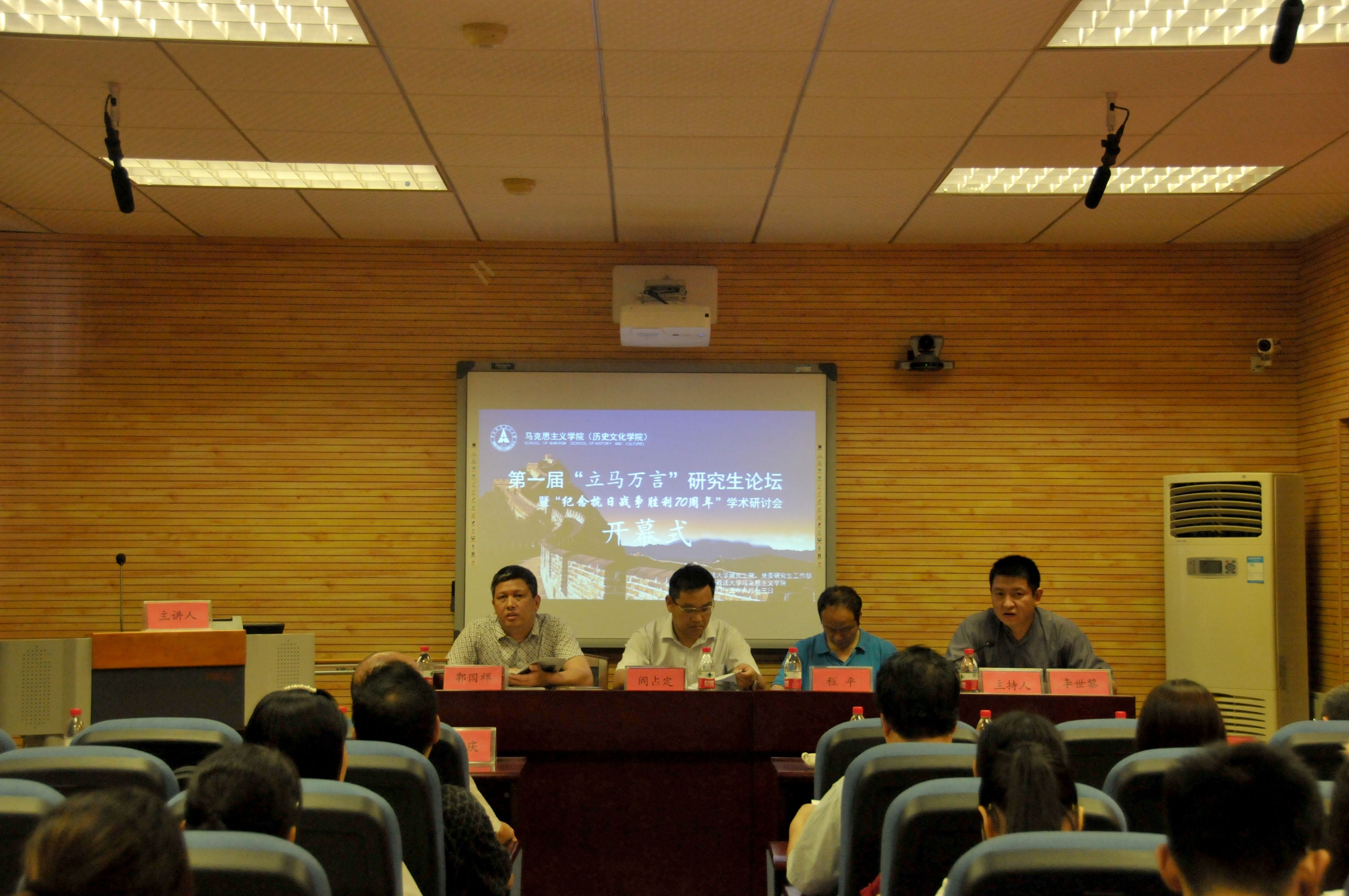 (学生记者:姬飞)为纪念抗日战争胜利70周年,2015年6月13号上午8:30,由米兰电竞·(中国区)马克思主义学院主办的第一届“立马万言”研究生论坛暨“纪念抗日战争胜利70周年”学术研讨会在我校文沛楼409会议室举行。会议邀请到了中南民族大学马克思主义学院院长阎占定教授、武汉理工大学马克思主义学院博士生导师郭国祥教授、《学习与实践》杂志社程平研究员等嘉宾评委。我院领导、各专业导师组组长和参与投稿的华中师范大学、武汉大学及米兰电竞·(中国区)的学生参与了本次研讨会。