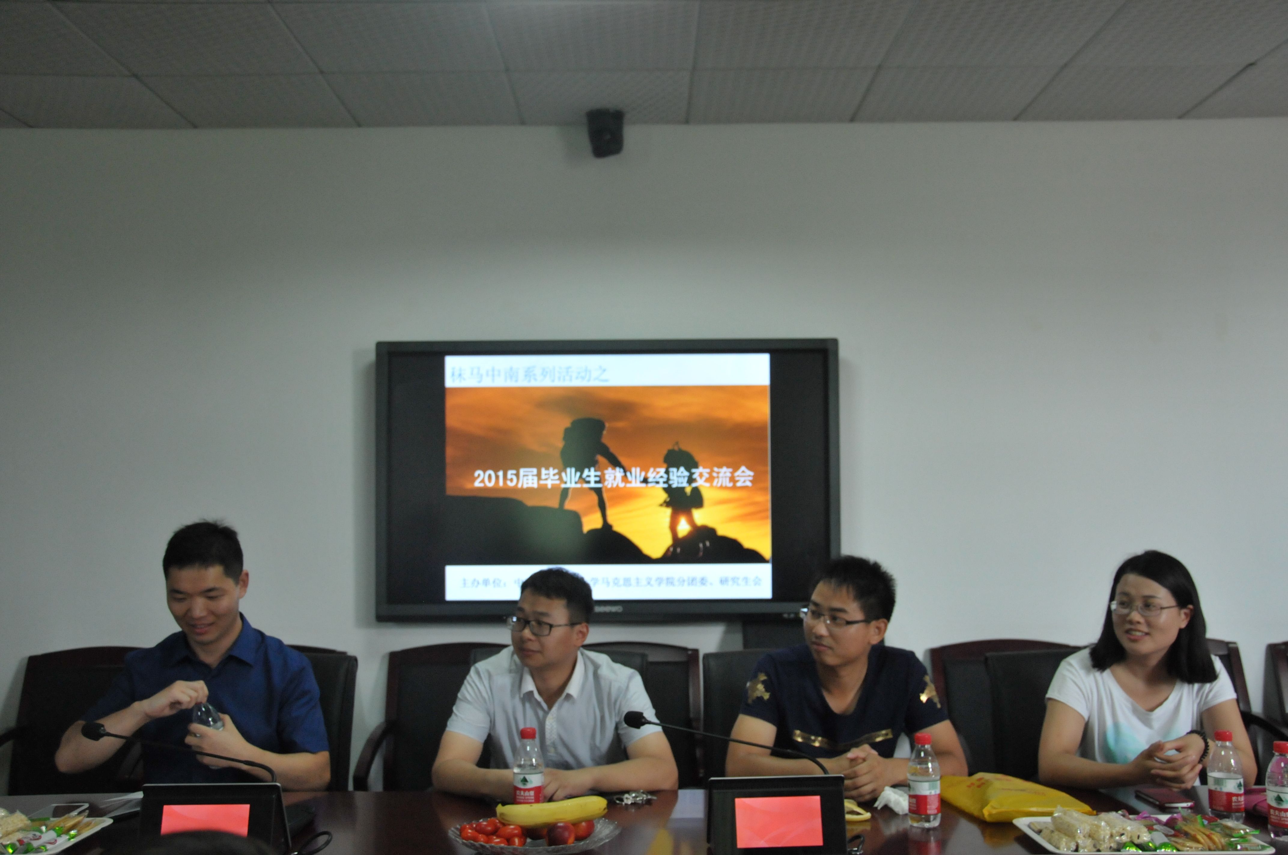 (通讯员:姬飞)2015年6月18号,马克思主义学院在文沛楼402会议室举办2015届毕业生就业经验交流会,交流会邀请到2015届朱冲、王楚云、唐剑彦、雷从科和熊健等五位同学向学弟学妹传授就业经验,2013、2014级同学积极参与了本次交流会。