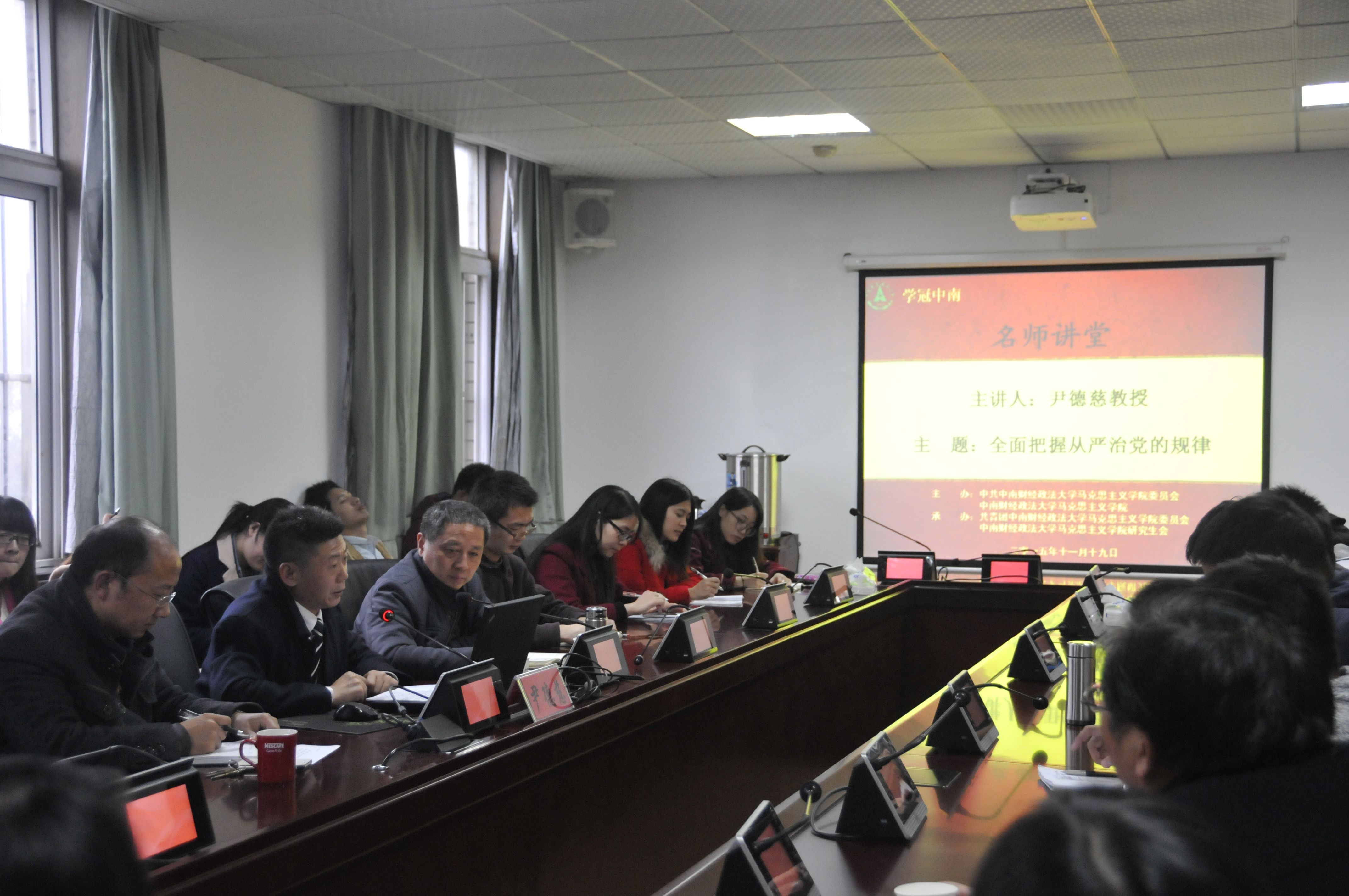 从严治党是中国共产党治党的重要原则,从严治党是中国共产党适应执政、改革开放和发展社会主义市场经济的新情况新问题而提出的加强党的建设的基本方针和根本要求。尹教授从三个方面论述了全面把握从严治党的规律。首先他从大党角度论述了治党规律,他谈论了国外的一些大党派是如何治党并例举了大党在治党时出现的诸多问题和经验教训。尹教授指出,大党在治党时不止一次的出现的问题就要从规律中去认识问题。这也是他之所以选择从规律的层面论述从严治党的原因。既然各大党会出现诸多问题,那么中国共产党难免也会遇到相应问题。总结了大国治党的规律就要从以往经验教训中得出经验,不能把别的党犯过的错都犯一遍。这对中国共产党在以后的治党方面是有帮助和警示作用的。随后,尹教授由此谈论了中国共产党的治党规律。中国共产党始终贯彻落实群众路线、保持党同人民群众的血肉联系。探索和遵循新的历史条件下从严治党的规律是面对各种考验和风险,始终保持党的先进性纯洁性的保证。从严治党的根本就是紧紧抓住党和群众的关系,以坚持党的群众路线为主线。从严治党严在哪里、治在何处,都要以群众拥护不拥护、满意不满意为标准。最后,尹教授论述了中国共产党的治党问题和现阶段怎样从严治党。中国共产党存在着管理层级太多的问题,只能一级管一级,从上到下一级一级的传达。面对这个问题,中国共产党应该减少管理层级——做到扁平化组织治党。减少管理层级可以让领导层更直接的与下级沟通,并且可以提高党的办事效率。另外,中国共产党还存在科层制即官僚主义问题。因此,中国共产党的领导干部一方面要多了解群众的需求,不能脱离了群众。另一方面也不能无所作为的做个“老好人”。中国现在出现的问题,需要重视和认真对待,以后要向制度科学化迈进。