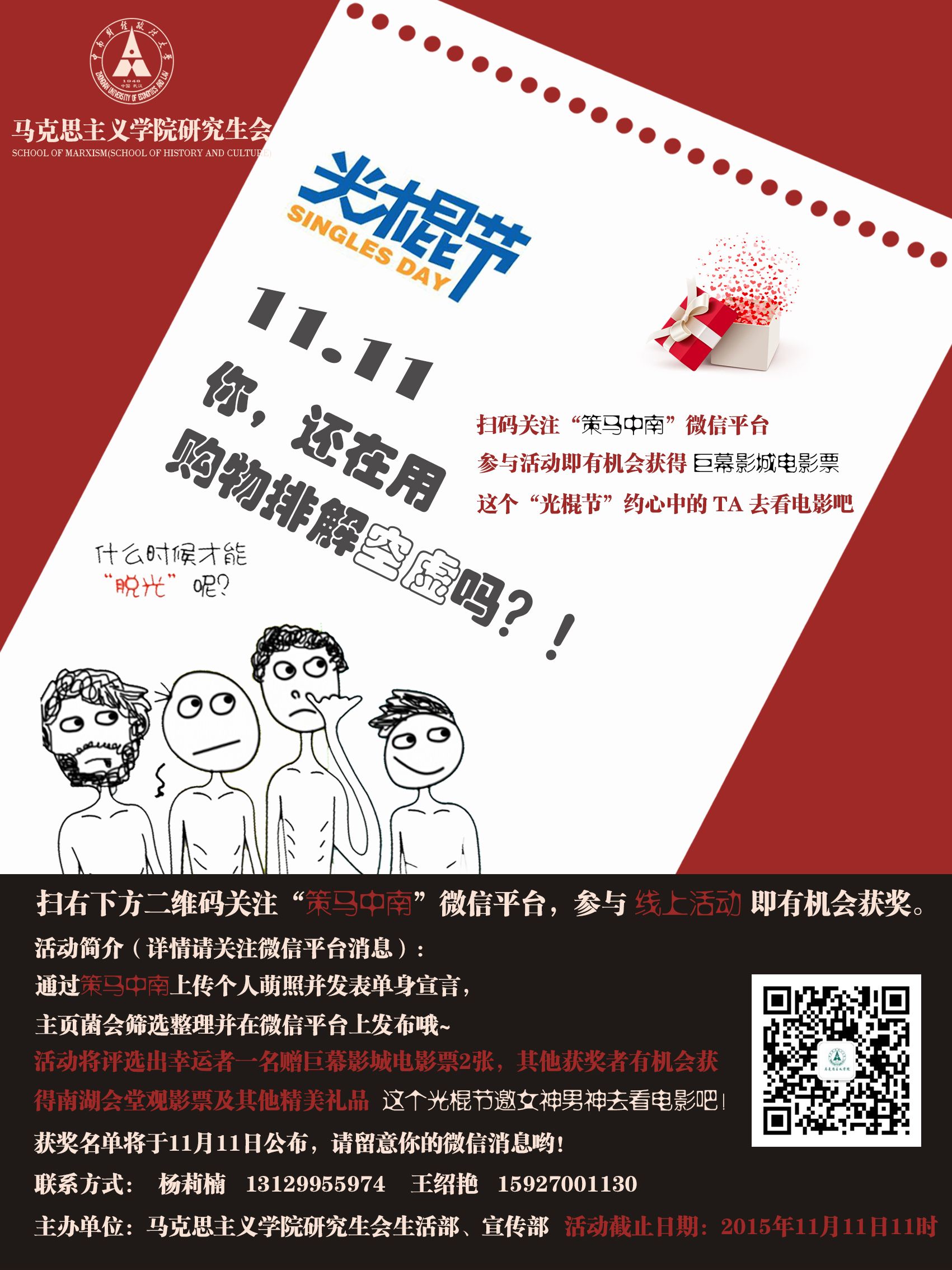 11月11日是近些年在年轻人群体中兴起的“光棍节”,其中高校大学生是主要的参与者。依据“光棍节”的氛围和特点,马院研究生会生活部与宣传部结合大学生对于恋爱观的心理调查与“策马中南”微信平台的运营推广,联合策划了主题为“我的双11,我的秀”的线上活动。参与者通过关注“策马中南”微信平台上传个性自拍照并发布单身宣言即有机会获奖。活动设置一名幸运奖和多名参与奖,奖品包括巨幕影城电影票、巧克力和小糖果等小奖品。在参与有奖活动同时,参与者需完成一份由马院“心丝带”心理健康小组组织的大学生恋爱观的心理测试题。 “我的双11,我的秀”线上活动得到同学们的支持和参与,并取得了良好效果。“策马中南”微信平台是马克思主义学院新建的官方微信平台。在科研学术方面,该平台致力于向广大学子传播先进思想、前沿理论研究和学术科研方法。在生活方面,马克思主义学院“心丝带”心理健康小组以微信平台为依托,通过举办线上活动丰富学生课余生活,缓解学业压力。该活动的举办提高了“策马中南”的知名度,对于“策马中南”微信平台的推广具有积极意义。