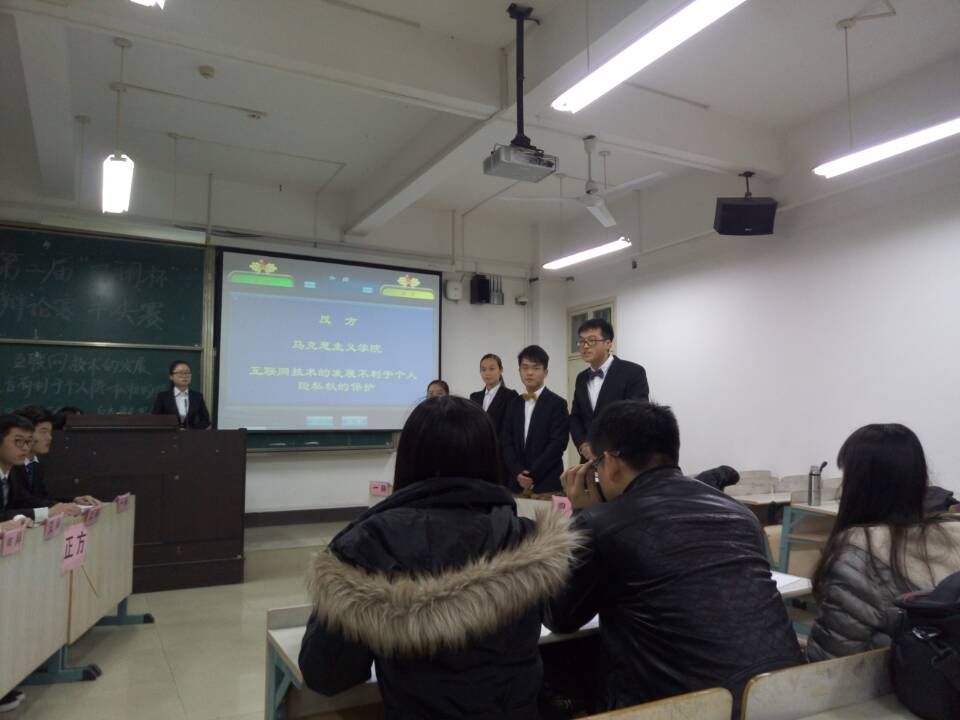 本次比赛的辩题是:互联网技术的发展是否有利于个人隐私权的保护。代表正方观点的财政税务学院辩论队坚持互联网技术的发展有利于个人隐私权的保护,代表反方观点的马克思主义学院辩论队坚持互联网技术的发展不利于个人隐私权的保护。本次比赛马克思主义学院辩论队的队员分别是:一辩王璐同学、二辩孙佳越同学、三辩胡立文同学、四辩石磊同学。在充分总结、吸收前两轮辩论经验和一个星期积极准备的基础上,马克思主义学院辩论队在辩论赛场上不断完善自己。
