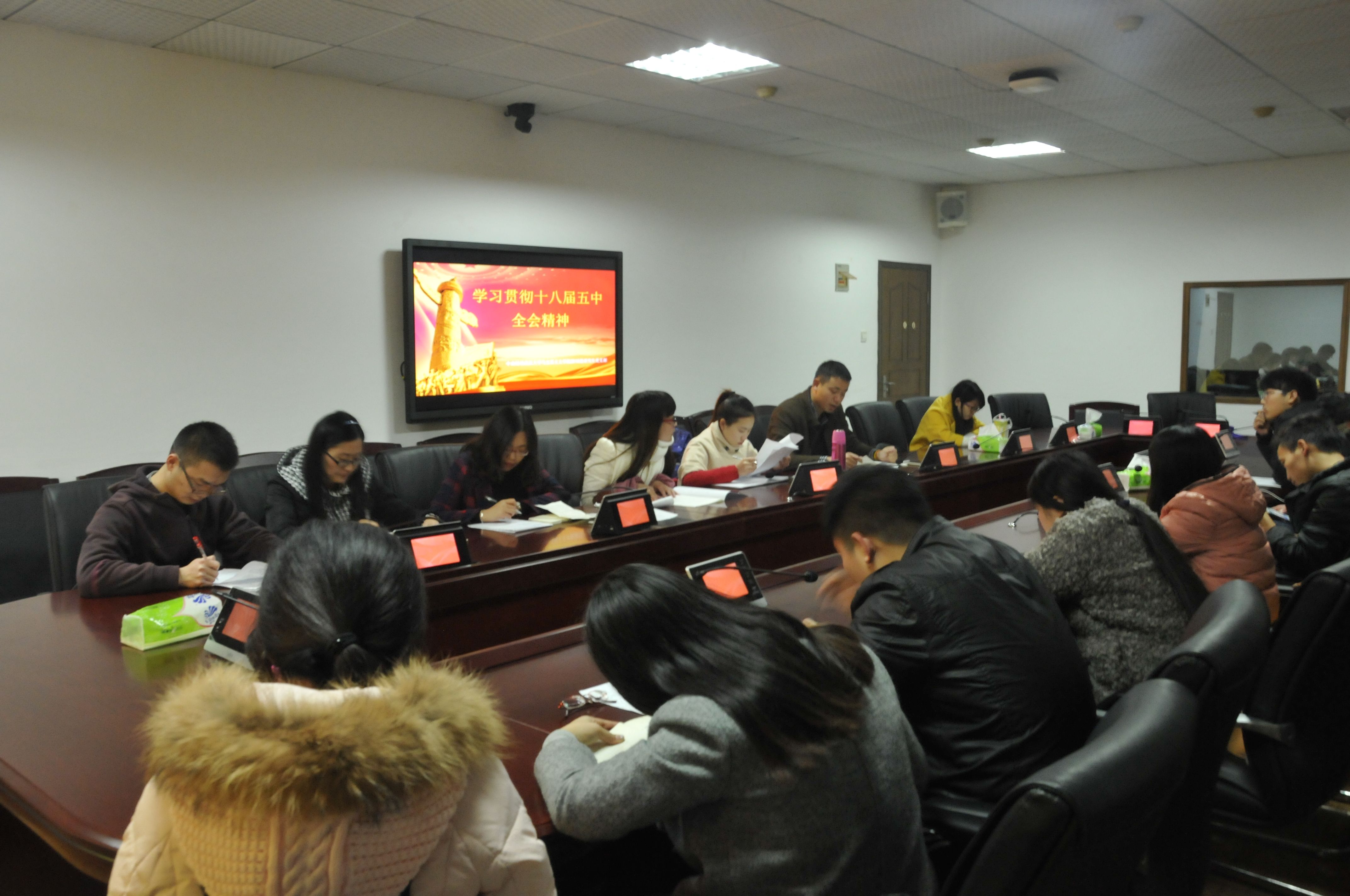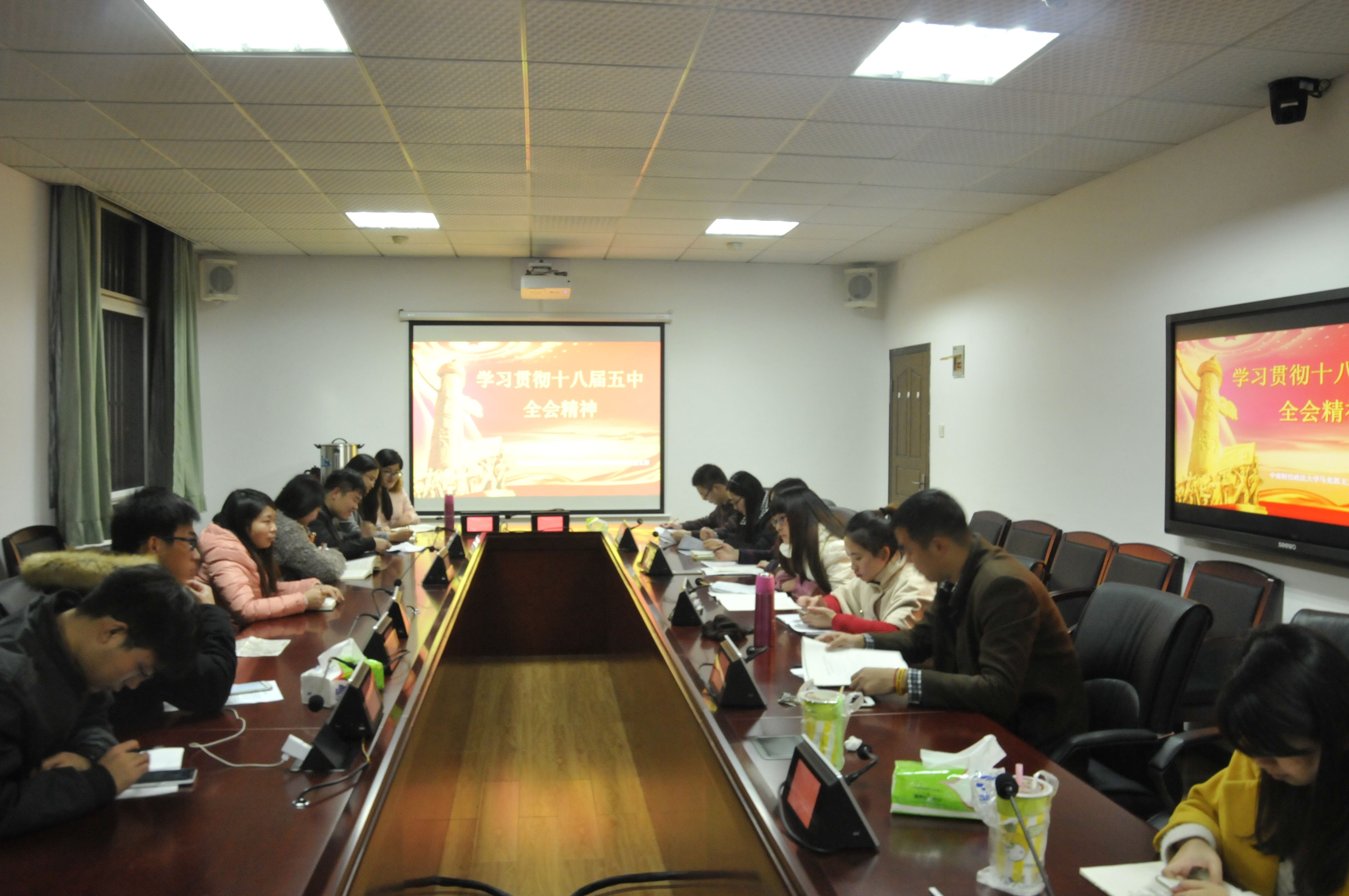 (通讯员:童吉鹏 摄影:刘豪)2015年12月8日晚上七点,马克思主义学院2015级研究生党支部在文沛楼402会议室召开“学习贯彻十八届五中全会精神”专题学习会,学习党的十八届五中全会精神。学习会由15级党支部书记童吉鹏主持,研究生全体党员参加了此次学习,非党员同学也列席参加了本次学习会。