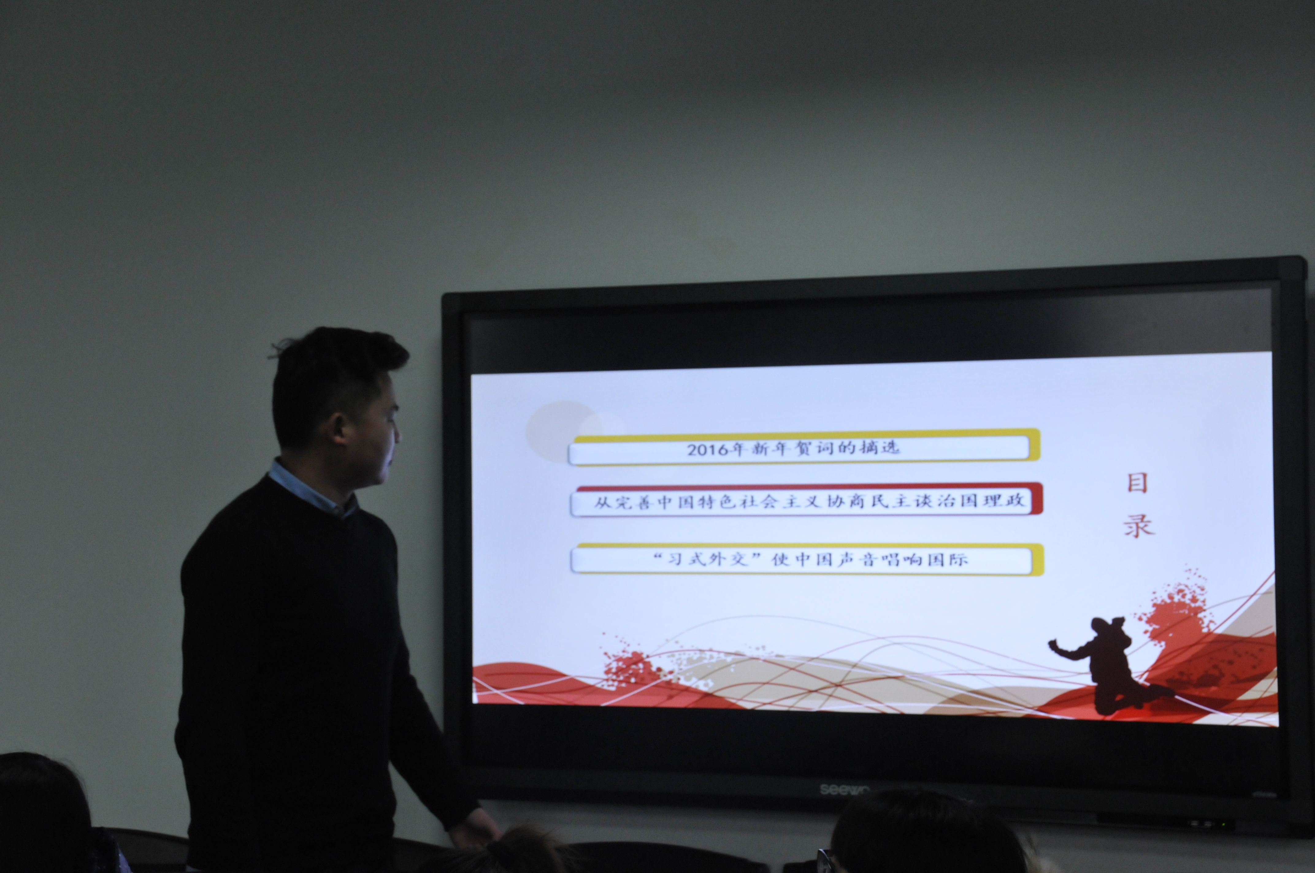 在三位同学发言完毕后,张少鹏老师对三位同学的发言点评。他表示同学们的发言充分体现出大家对两篇文章的深入学习和发言前的充分准备,并对同学们独到的见解表示赞赏。随后,他从中国在大国、周边的外交政策,阐述了从历史升降起伏规律来看,中国应把握好历史机遇,树立信心,坚信21世纪中国在世界上的地位是无可取代的,相信在未来的30年中国一定会实现中华民族伟大复兴的中国梦。