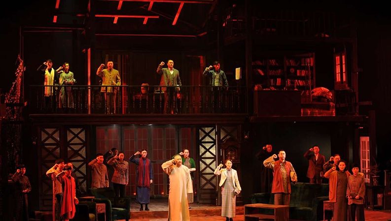 全剧的舞台效果也非常震撼,舞台上搭建起一座三层的小楼,还原出上海周公馆的风貌,简朴的客厅,堆满书的书房,屋外的花园,通过转台的运转,让小楼变幻出不同的表演空间,而庭院里蜿蜒而上的藤蔓,爬满台阶的青苔,为小楼增添了不少绿意,也向观众暗示着春天的希望。和舞美辉映的还有该剧出色的音效设计,长征途中隆隆的炮声,民众支持共产党人反对内战的呐喊,都通过环绕立体声在剧场的每个角落回荡,让观众顿生身临其境之感。当全剧结尾,董老率领办事处的全体人员重温入党誓词,高唱起国际歌时,慷慨激昂的歌声带着观众澎湃的心潮一起回荡。