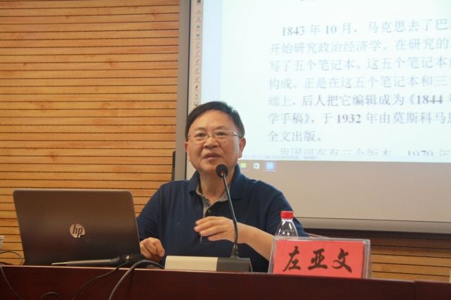 讲座中,左亚文教授从“《手稿》之争——时代的回望与反思”、“人的异化及其本质根源——‘劳动异化’的解读”和重释”和“扬弃异化与共产主义——共产主义的解读与再思”三个部分,运用通俗易懂的语言,多层次、多视角地阐述“马克思《手稿》异化劳动思想”。在第一部分,左教授首先回顾总结了《手稿》的写作背景。《手稿》是马克思1844年底在巴黎所著作的一部手稿,但由于种种原因,在马克思生前并没有发表。后人将其笔记整理成《1844年经济学哲学手稿》。接着,左教授通过对“《手稿》的写作和出版”的历史考察,介绍了马克思研究政治经济学,剖析市民社会的基本情况。左亚文教授还提到,《手稿》传入国内后在马克思主义理论界引起了强烈的反响和热烈的讨论,主要有抬高和贬低《手稿》两种倾向。在第二部分,左教授梳理了王若水和卢卡奇等学者关于“异化”的解释,并总结出自己对“异化”定义。在第三部分,左教授指出马克思在异化劳动理论的基础上首次阐发了他的共产主义思想,初步论证了共产主义的历史必然性,探讨了共产主义关于人的自由发展和社会全面进步的问题,指明了扬弃异化的途径。