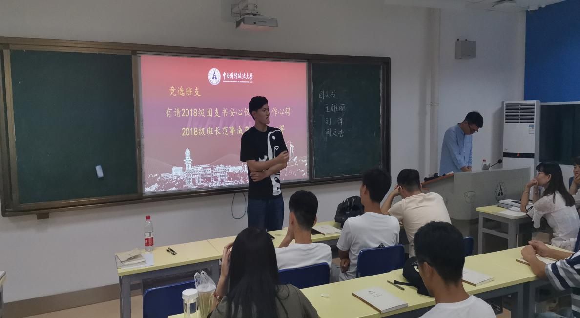 班会第三部分是进行新班级团支书和班长的竞选。在竞选之前,先由2018级团支书安心仪同学、班长范事成同学与新生们交流工作心得,分别从工作内容、工作要求和责任担当等方面展开,强调工作职责的重要性。随后,竞选正式开始,本着“公开公正公平”的原则,让每一位同学逐一上台表达自己的竞选意愿,并对未来的学生工作提出自己的构想,充分展示了新生的风采和活力。在同学们竞选演讲结束后,由2019级全体新生进行投票,最终在紧张而又热烈的投票之后,由杨威老师公布结果,刘洋、徐智航两位同学成功当选团支书、班长。竞选结束后,杨威老师借用习近平总书记的一句话“我们都在努力奔跑,我们都是追梦人”,希望在新的班委带领下新的班级可以奋发向上,不忘初心,抓住每一次锻炼自己的机会,不辜负研究生阶段三年的美好岁月。