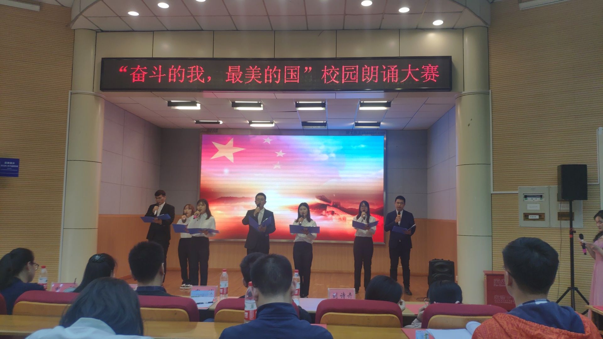 比赛伊始,法学院带来诗朗诵《青春中国》,讲述了七十载中国大地沧桑巨变,苍山如海,泱泱中华,风光无限,荡气回肠。经济学院带来了诗朗诵《与妻书》,百年前,为振兴中华,24岁的青年林觉民英勇就义,留下绝笔《与妻书》,百年后,林觉民悲痛的破碎山河已花开满地,希冀的优秀儿女已代代长成。我院作为最后一支参赛队伍,为大家带来诗朗诵《祖国啊,我亲爱的祖国》,滔滔江河水,淹不尽浩浩中华魂;巍巍昆仑山,锁不住阵阵中华风;将歌万里河山,赞祖国荣光。各个学院的诗朗诵万丈豪情,颂青春梦想。