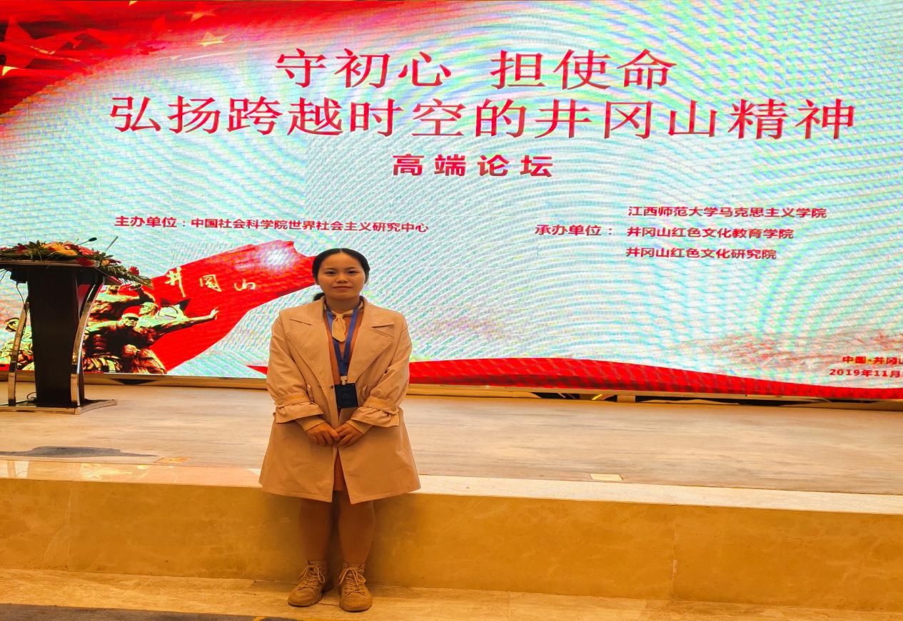 (通讯员 李婷)为庆祝中华人民共和国成立70周年、弘扬井冈山精神,2019年11月9日,“守初心 担使命 弘扬跨越时空的井冈山精神”高端论坛在井冈山红色文化教育学院举办。本次论坛由中国社会科学院世界社会主义研究中心主办,江西师范大学马克思主义学院、井冈山红色文化教育学院和井冈山红色文化研究院共同承办。我院学子李婷受邀参加本次论坛。