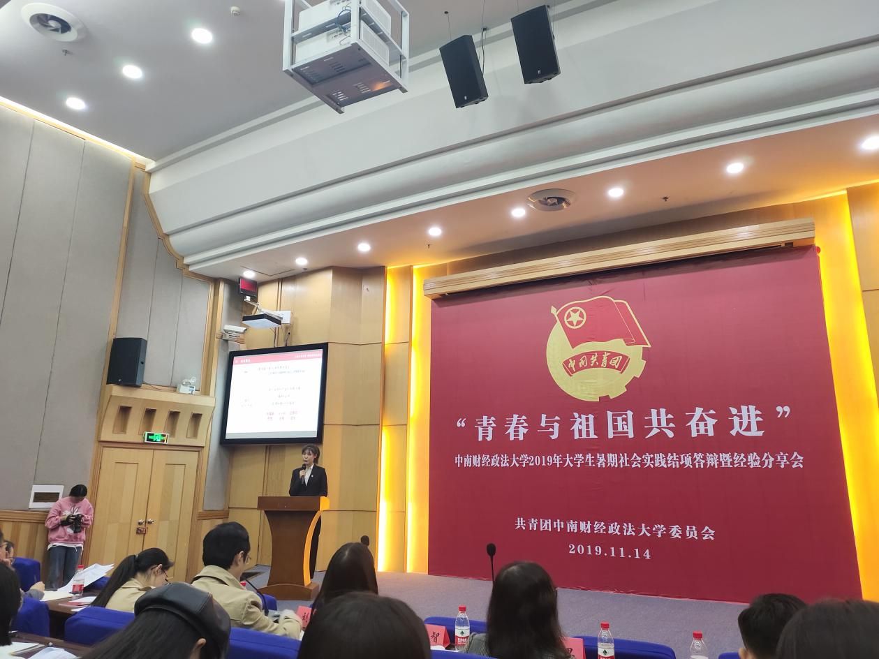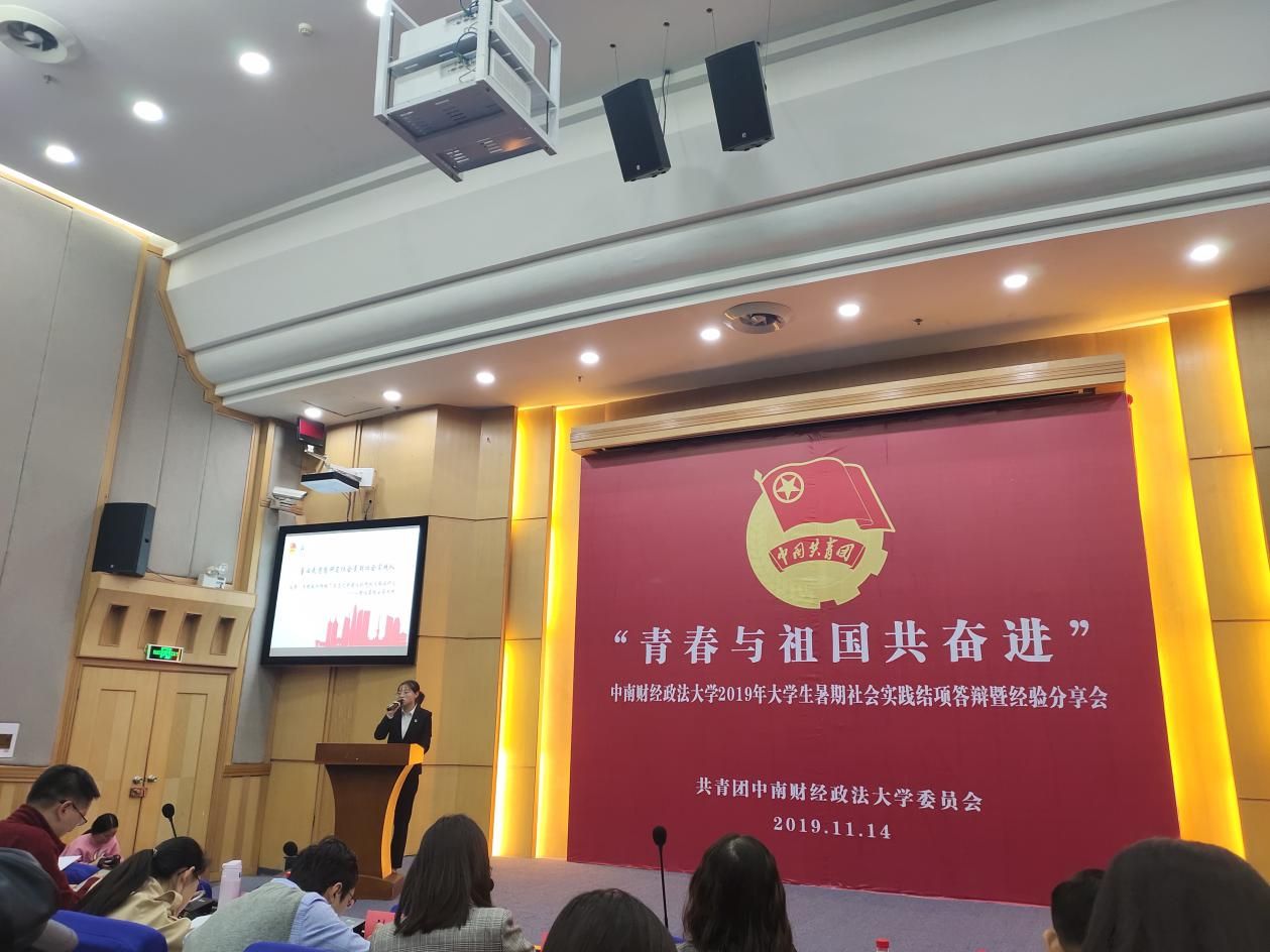 (通讯员 严定举 摄影 李婷)2019年11月14日,为充分检验实践成果、分享先进经验、树立青年榜样,由校团委举办的“青春与祖国共奋进—2019年大学生暑期社会实践结项答辩暨经验分享会”在首义校区文汇楼二楼浙晓报告厅举行。经自愿报名、资格审查、综合评议等程序,最终有12支队伍入围现场答辩环节,我院共有“汇聚青春力量·青年基层宣讲队”和“董必武思想研究协会暑期社会实践队”两支队伍参加此次答辩会。
