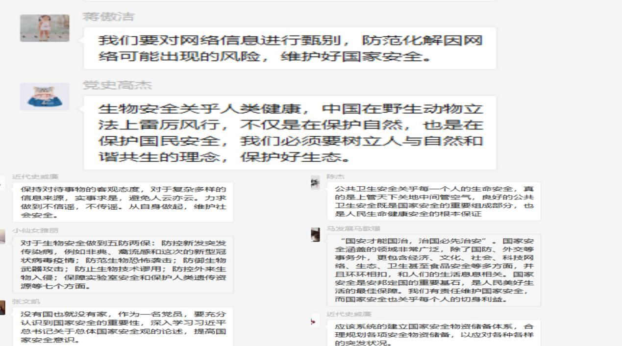 在新冠病毒危及全球的大背景下,增强全民国家安全意识,维护国家安全尤为重要。按照上级部门工作部署要求,我院组织学生通过长江云在线观看由湖北省国安办制作的国家安全宣传专题片——《国家之安 人民至上》、《生物安全与公共卫生 安全专家访谈》。《国家之安 人民至上》宣传教育专题片以新冠肺炎疫情阻击战为切入点,从公共卫生安全、食品药品安全、生态安全、信息安全等方面,通过人民战“疫”过程中的典型事件和人物,阐述一切为了人民,一切依靠人民,不断提高人民群众获得感、幸福感和安全感的总体国家安全观。在《生物安全与公共卫生 安全专家访谈》中,各领域专家积极齐聚一堂,从自身专业角度分析梳理了生物安全的类型及防控措施。中科院武汉病毒研究所副所长关武祥指出生物安全与每个人生活息息相关;华中科技大学同济医学院副院长、公共卫生学院院长邬堂春强调加强公共卫生应急管理体系建设是当务之急;武汉市金银潭医院院长张定宇强调要坚持关口前移,时刻绷紧疫情防控这根弦;湖北省林业局副局长蔡静峰呼吁保护野生动物就是保护我们自己;湖北省生态环境科学研究院副院长凌海波指出要加强全过程监管,全省生态环境未受疫情影响。此专题片充分体现了中国共产党把人民群众生命安全和身体健康放在第一位的理念,突出公共卫生安全、生物安全等宣传教育内容,引导学生将总体国家安全观贯穿抗疫全过程,履行应对突发公共事件的职责义务,提升维护国家安全的自觉性和主动性。我院学子对这两部国家安全宣传专题片反响热烈,认真观看学习之后,在班级群就相关问题展开了热烈讨论。