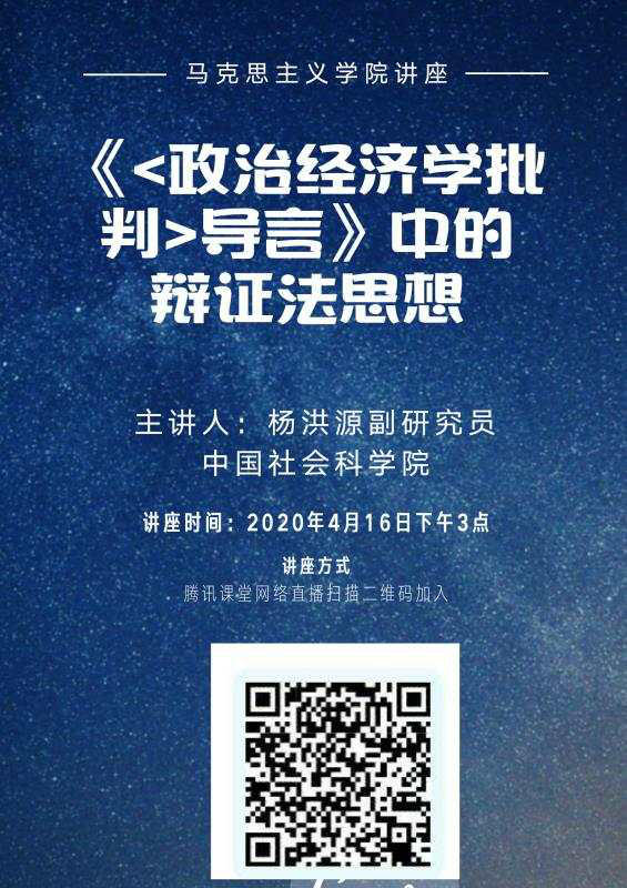 (通讯员 黄威廉)2020年4月16日下午,中国社会科学院副研究员杨洪源应邀来我院作了以《<政治经济学批判>导言中的辩证法思想》为主题的学术讲座。此次讲座通过线上网络课堂的方式进行,我院“基础理论学科群”教师、研究生线上“云”集合全员参与。