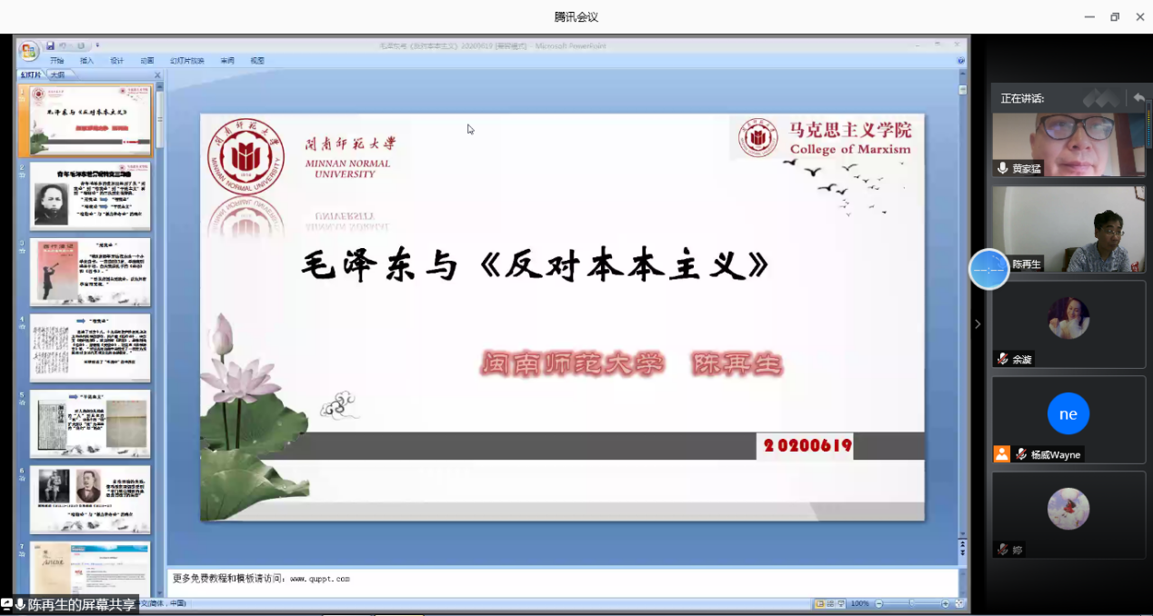 (通讯员 余漩)2020年6月19日晚,闽南师范大学马克思主义学院院长、校党委委员、硕士生导师陈再生教授受邀莅临我院开展以“毛泽东与《反对本本主义》”为主题的线上讲座。此次讲座由马克思主义教师黄家猛副教授主持,副院长韩美群教授、学科群教师以及马克思主义学院研究生共40余人参加。