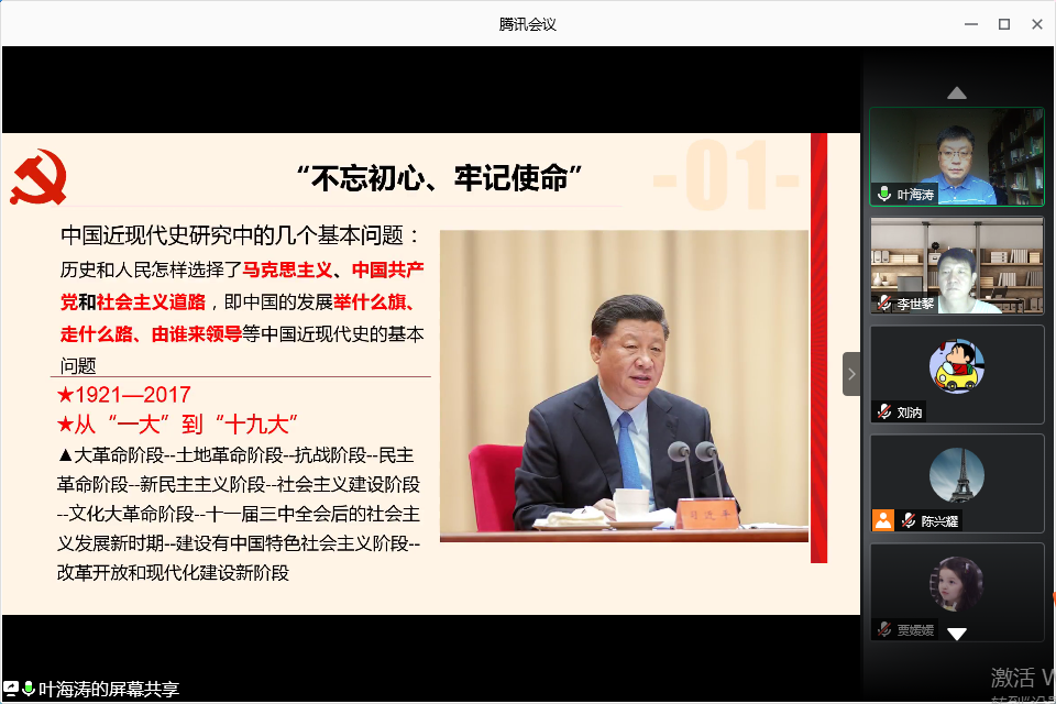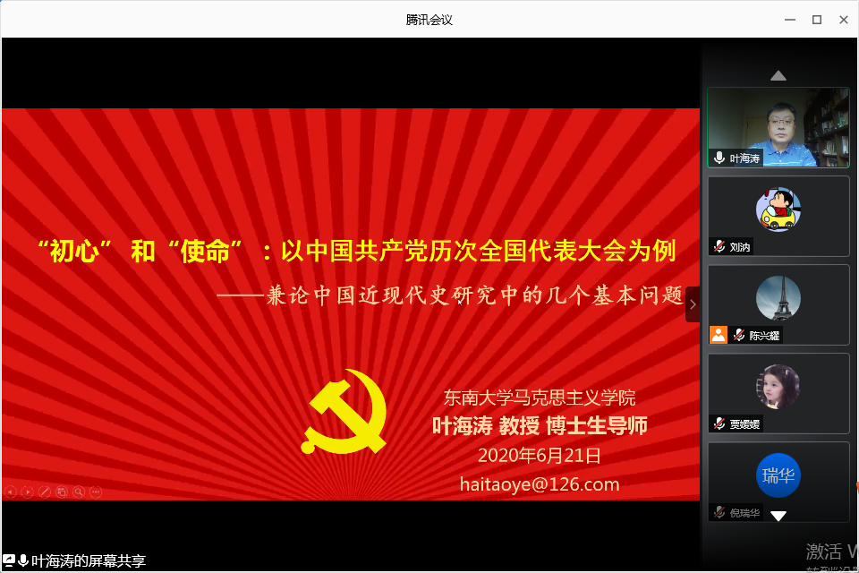 (通讯员 刘汭)2020年6月21日上午,东南大学马克思主义学院博士生导师叶海涛教授应邀来我院讲学。此次讲座以线上会议的方式进行,围绕“初心和使命:以中国共产党历次全国代表大会为例”这一主题展开,会议由倪瑞华教授主持,副院长李世黎副教授、学科群教师等30余名师生共同参加。