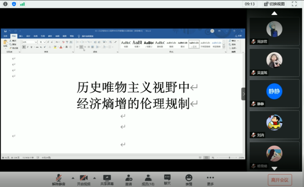 (通讯员 赵秋霞)2020年6月24日上午,山西财经大学继续教育学院法学博士李红岩教授应邀来我院进行讲学。此次讲座以线上会议的方式进行,围绕“历史唯物主义视野中经济熵增的伦理规制”这一主题展开,会议由倪瑞华教授主持,学科群教师与各年级研究生共30余名师生共同参加。