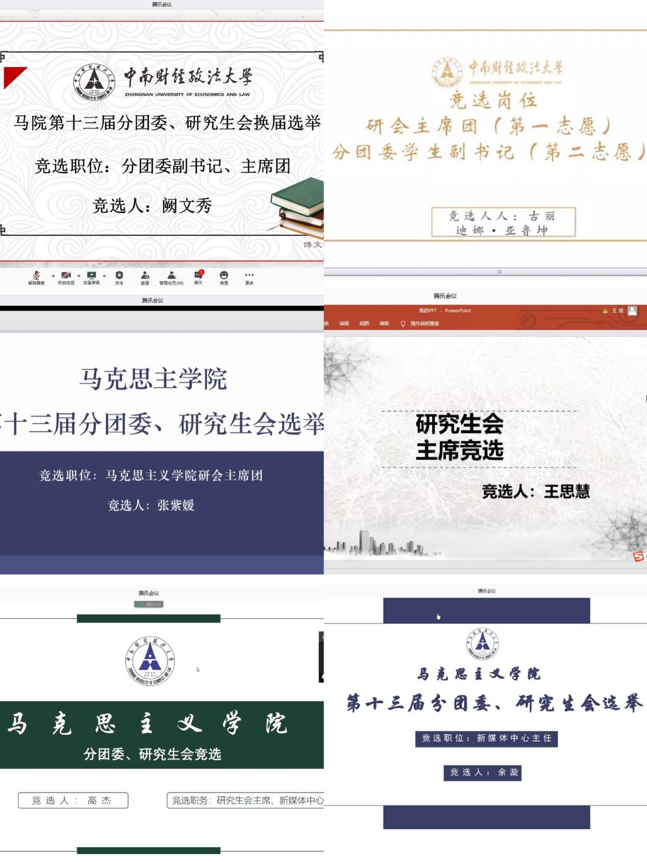 之后,第十三届分团委副书记、研究生会主席团以及新媒体中心主任候选人进行了竞职演讲。参加本次竞选的同学各自阐述了自己本学年的工作经历、竞选优势以及工作计划。各位同学畅所欲言,竞争激烈,充分展示出为马克思主义学院师生服务的热情。竞选演讲结束后,杨威老师以及2018级、2019级参会研究生通过线上APP问卷星进行了公开公平公正的投票,最终产生了第十三届分团委副书记、研究生会主席团成员以及新媒体中心主任。