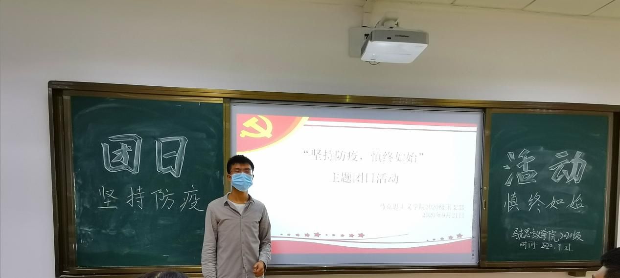(通讯员 朱文静 摄影 郭润宇)“秋风徐来,山河无恙”。为了帮助广大学生更好地了解防疫的重要性,在思想上保持警醒,在行动上积极践行,自觉保护防疫成果,真正做到“防疫有我,爱国力行”,2020年9月21日晚上7点,马克思主义学院2020级团支部在文澴楼415开展“坚持抗疫,慎终如始”主题团日活动,该活动由团委副书记阙文秀以及2020级团支部全体成员共同参加。