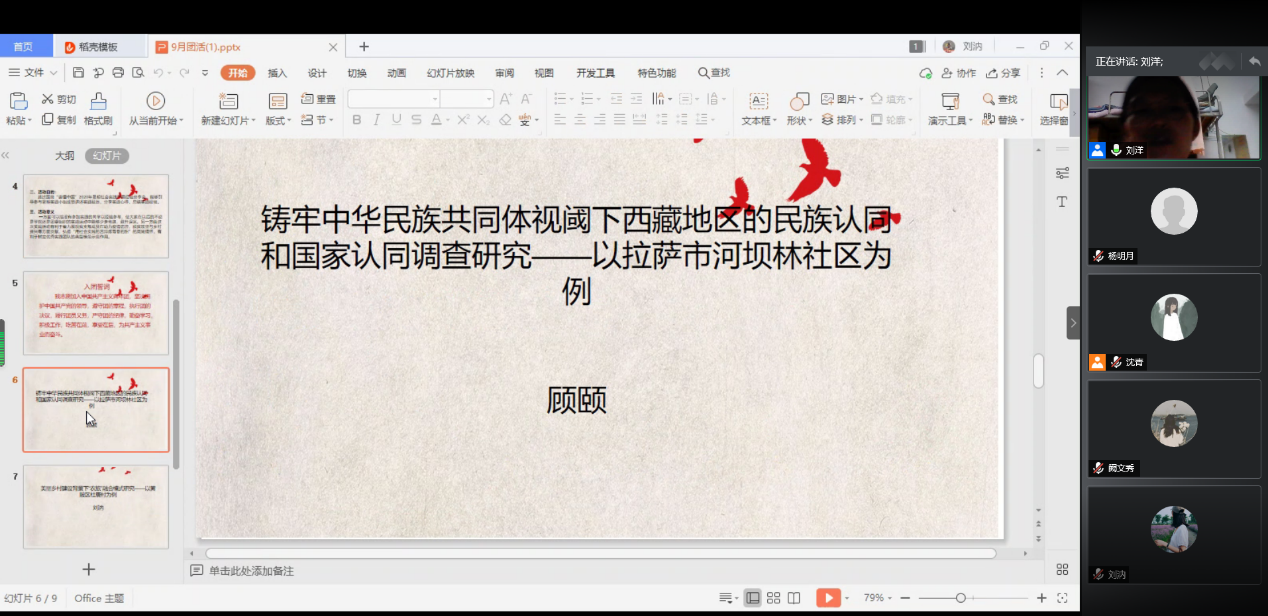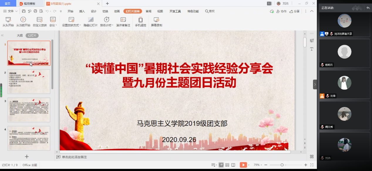 (通讯员 杨明月 摄影 陈静) 2020年,是决胜全面建成小康社会之年,也是脱贫攻坚决胜之年,广大青年学子应利用所学所思,以青年视角、关注中国变化、讲述中国故事、感悟中国魅力,积极致力疫情常态化形势下的国家发展和社会主义现代化建设,于实践中体验社会,于研究中“读懂中国”。2020年9月26日晚上7点,马克思主义学院2019团支部在线上开展本次团日活动,该活动由团支书刘洋主持,2019级团支部成员共同参与。