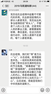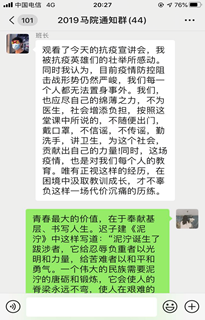 我院2019级和2020级学子对“青春在战疫中绽放”全国宣讲报告会(武汉)反响热烈,认真观看学习之后,分别在班级微信群和QQ群就相关问题展开了热烈讨论。中共党员郭润宇指出,在抗疫战斗中无畏的中国人民万众一心,众志成城,共克时艰,同舟共济,青年一代用行动证明了不是“垮掉的一代”,而是有本领、有理想、有担当的时代先锋;共青团员陈杰则发出“今天的青春战疫宣讲课,是一堂十分生动感人的思政课,除了发自内心的感动和敬仰之前,更让我感受到了祖国的伟大,中国人民的伟岸。作为青年一代的我们更应该肩负起时代赋予我们的使命,肩有大任,胸有大志,心有大爱,勇于担当,让青春之花在为祖国和人民服务中绽放绚丽之光,用努力奋斗的青春,把自己成就为一个有理想,有本领,有担当的时代新青年。”的深情感慨。