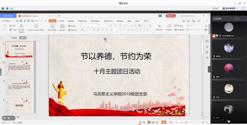(通讯员古丽迪娜·亚鲁坤摄影杨明月)为深化我院学子对建设节约型校园先进思想的认识,切实培养节约习惯,弘扬“浪费可耻、节约为荣”的传统美德,响应疫情防控号召,2020年10月25日7点,马克思主义学院2019级团支部线上开展“俭以养德,节约为荣”主题团日活动。此次活动由团支部书记刘洋主持,由2019级硕士研究生共同参加。