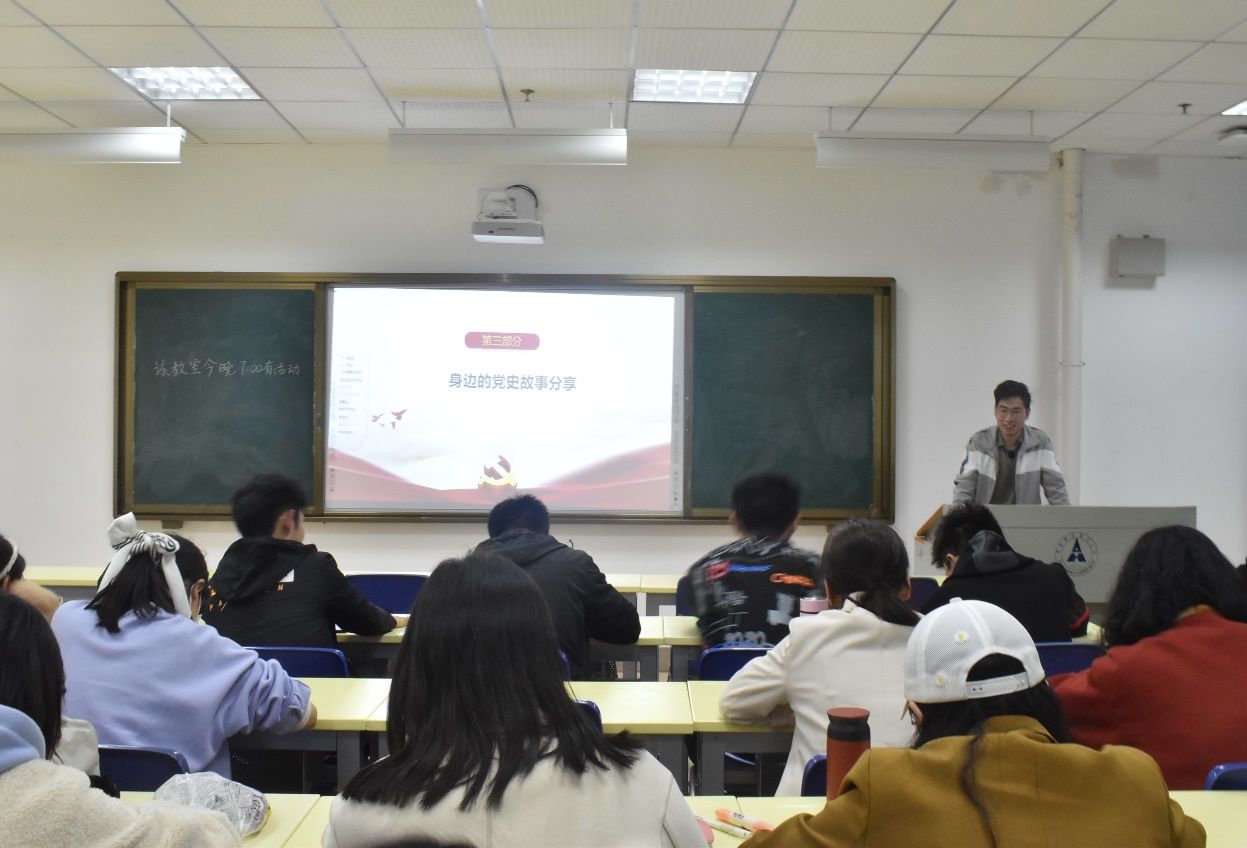 首先,主持人播放习近平总书记在党史学习教育动员大会上的讲话视频,通过观看视频,同学们深有感悟,清晰认识到加强自身党史学习正当其时。活动进行到第二项,由谭皓、冷诺岚、郭润宇三位同学依次上台讲授微党课,进一步加深了同学们对党史的把握。接着,主持人邀请党员方聪同志和万喜同志就发生在自己身边的党史故事向同学们分享,更加激发了同学们加强自身党史学习的热情。最后文体部提供了一段短视频,生动的影像资料给同学们带来一场百年党史的视觉盛宴,该视频为本次活动起到了活跃气氛的重要作用,使得同学们都热情参与到当党史学习教育的交流讨论之中。