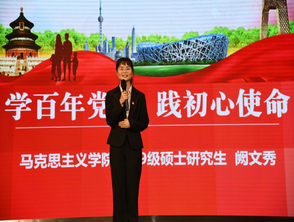 在大会上,阙文秀同学以《学百年党史 践初心使命》为宣讲主题,向与会人员分享党史学习经验。她带领大家追溯一叶红船,大家翻开百年党史长卷,纵览历史的足迹,以我院党史百年见证者毛磊教授的坚守学者初心、青年教师张瑞堂的潜心思政课育人之本、学子古丽迪娜·亚鲁坤疫情期间的志愿奉献为例,展现我院三代人对情怀信念、初心使命的践行。最后,阙文秀同学号召同学们立足建党百年之际,延续红船精神,在传承中践行使命,为实现中华民族伟大复兴中国梦凝聚青春力量。