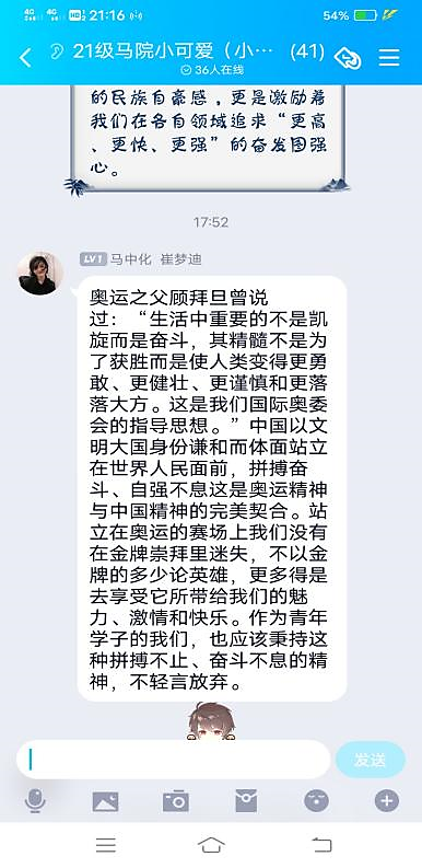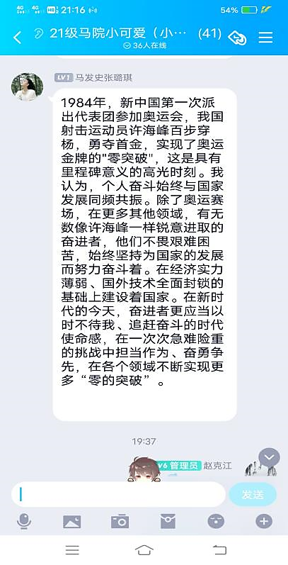 2021级中国近现代史专业李兴华同学表示:很高兴能够在本次‘同上一堂奥运思政大课’活动中再次见到了几张无比熟悉的面孔,正是无数中国奥运健儿流下的点滴汗水,才得以让我国在不过短短数十年间一跃发展成为世界体育强国。一枚枚奖牌上承载的不只是人民的期许,更是民族的骄傲,更是激励着我们在各自领域追求‘更高、更快、更强’的奋发图强心。