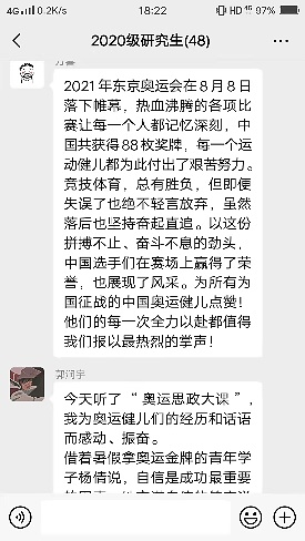 本次思政大课以奥运健儿讲述奥运故事、接受问答等形式,展现中国奥运健儿传承发扬拼搏奋斗、全民体育等精神能量。看完这场生动感人、极富正能量的直播课程后,同学们精神振奋,纷纷发表了自己的观看感悟。