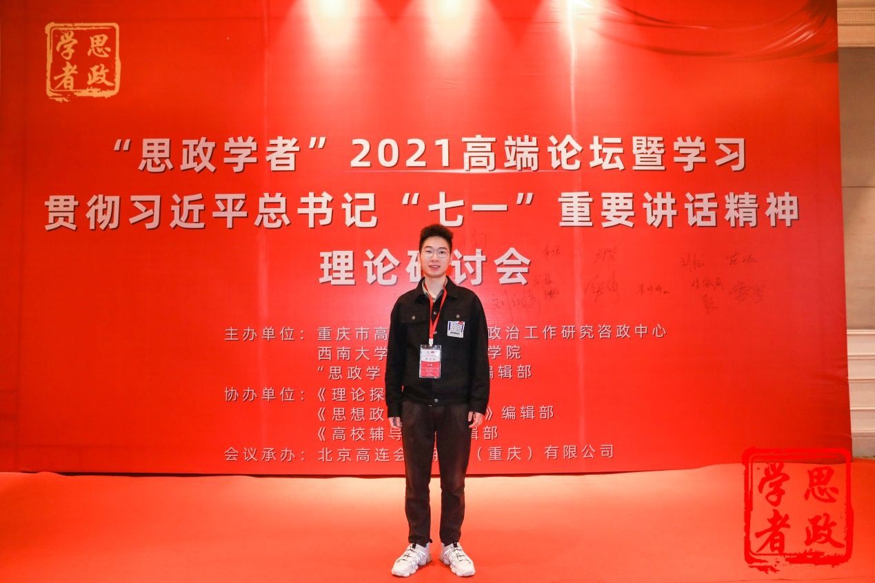 (通讯员 方聪)10月23日,由重庆市高校师生思想政治工作研究咨政中心(以下简称“中心”)、西南大学马克思主义学院、“思政学者”公众号编辑部共同主办的“思政学者”2021高端论坛暨学习贯彻习近平总书记“七一”重要讲话精神理论研讨会在重庆银鑫世纪酒店召开,论坛同步进行了网络直播。我院学子方聪受邀参加会议。
