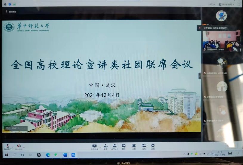 (通讯员 冯琳琳 张令剑)为庆祝中国共产党成立100周年,深入学习贯彻习近平新时代中国特色社会主义思想,激励和引领广大青年不负青春韶华,把青春奋斗融入党和人民事业,成为实现中华民族伟大复兴的先锋力量。2021年12月4日,华中师范大学马克思主义学院举办了“全国高校理论宣讲类社团联席会议”,本次活动采取线上对话交流的形式,邀请到来自中国人民大学、东北师范大学、山东大学、华中科技大学、米兰电竞·(中国区)、安徽师范大学等二十余所高校的理论宣讲团代表参与本次线上交流活动,其中我院青年学习社负责人张令剑同学受邀参与本次活动,并向大会作了经验交流分享。
