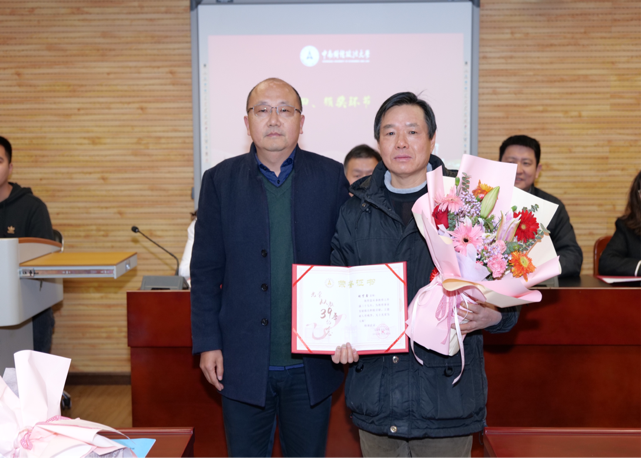 学院党委书记张文剑总结讲话。他表示,近期学院官微推送的23位老师从教三十余载千字感言、老师们现场的发言,都是一堂生动的思政教育党史课。他谈及三点感想,第一,代表学院祝贺23位教师,向全体教职工送上元旦和新春祝福,对为学校建设发展做出贡献的离退休同志表示崇高敬意。第二,引用《左传》名言“人生三不朽,立德、立功、立言”,23位老师在中南大马院书写了不朽人生。立德,立德树人之德,明大德、守公德、严私德,自觉遵守新时代高等学校教师职业行为十项准则,自觉用中华优秀民族传统文化培根铸魂、启智润心。立功,“功成必定有你们,一定要对你们好一些,这是你们立的功”,学院取得的所有成绩离不开广大教师几十年如一日的辛勤耕耘和默默奉献。立言,著书立言,学院的思政课教师是胸怀“国之大者”,以大道引领传道、以大业引领授业、以大爱引领解惑,在传道授业解惑中诠释着新时代的立言。第三,此次表彰大会的目的是致敬从教三十余年的教师,传承良好师德师风,强化青年教师初心使命,激进奋进的力量,为建设高质量马院增光添彩,他提出三点与青年教师共勉:一是做“大先生”,立德树人,培养好学生,延长生命长度;二是做“超能手”,团结团队,献力学科建设,拓展生命宽度;三是做“教书匠”,把论文写在祖国的大地上,做好学术,增加生命高度,努力做到一名具有长度、宽度、高度的“立体高校人民教师”。