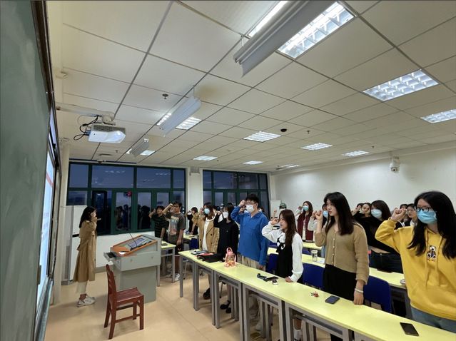 其次,由张金燕同学带领全班同学高唱团歌,激昂的青春旋律回荡在同学们的脑海之中,充盈着整个教室。