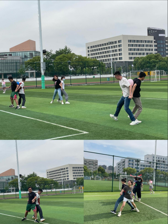 第二项赛事为背对背夹气球跑,由每组派两名队员参赛。参赛者两手交叉紧握,背对背夹住气球横向向前跑。比赛中,各小组状况不断,出现气球变形、气球掉落、两人步调不一致耗时过多等问题。但每一组都反应迅速,在失误后及时调整,继续向前,整个田径场阵阵欢闹。