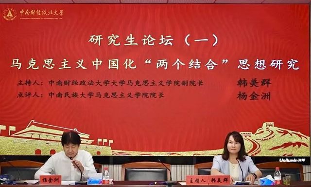 上午10时30分,以“马克思主义中国化‘两个结合’”思想研究”为主题的研究生论坛(一)正式开始,该论坛由我校马克思主义学院副院长韩美群教授主持,来自中国人民大学的吴楠和钟思雨、武汉大学的戴一帆、国防大学的贾磊、以及厦门大学的吴春金、胡亚珂分别以中华优秀传统文化对人民美好生活的影响、毛泽东中西方文化观的考察以及马克思主义基本原理与中国传统文化的结合为主要内容作汇报。中南民族大学马克思主义学院院长杨金洲教授就主题报告一一作点评。