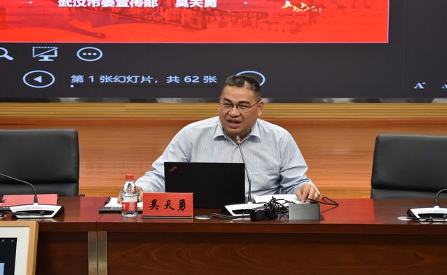 (通讯员 韩周俊佼)2022年6月10日下午,为加强高校意识形态安全建设,筑牢新时代高校意识形态阵地,党委宣传部、马克思主义学院特邀请中共武汉市委宣传部副部长、市社科联主席吴天勇莅临我校讲学。党委宣传部干部代表、马克思主义学院教师、研究生代表参加学习。