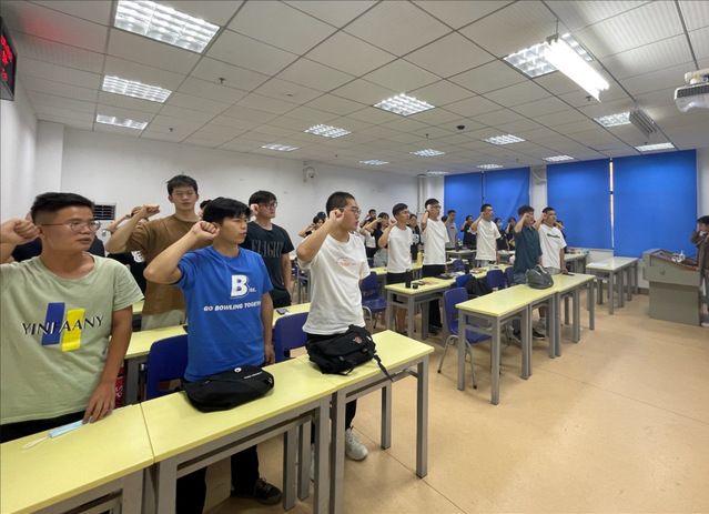 团支书彭卓曦向大家简要介绍了本次活动的主要目的和主要内容,并宣布活动正式开始。首先,彭卓曦同学带领全班同学高唱团歌,激昂的青春旋律充盈着整个教室,回荡在每一位团员的脑海之中。紧接着,全体团员重温入团誓词。全体团员们举起右手,面对团旗郑重宣誓,重温加入中国共产主义青年团的光辉历程。