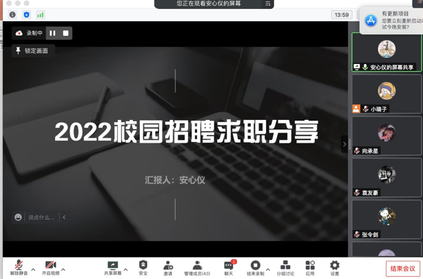 (通讯员 葛燕燕)为解决毕业生就业难题,帮助准毕业生了解疫情下的就业形势和就业政策,促进准毕业生高质量就业,马克思主义学院于10月2日晚7点在线上开展以“薪火相传 梦想启航”为主题的论文写作与求职经验交流会。此次交流会特邀2021届优秀毕业生马克思主义基本原理专业安心仪担任嘉宾分享经验。本次交流会由贾宇璐主持,研二、研三全体研究生参与交流学习。