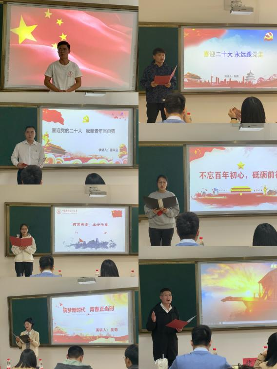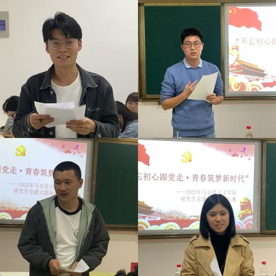 (通讯员 彭佩凡 摄影 任晓玮)为迎接党的二十大胜利召开,引导广大研究生增强“四个意识”、坚定“四个自信”、做到“两个维护”,展现研究生群体奋发向上的精神风貌,马克思主义学院于10月12日晚在文澴楼517教室举办“不忘初心跟党走•青春筑梦新时代”研究生党建主题演讲比赛。本次活动特邀马克思主义学院辅导员林昇、李祥栋老师、校研究生党员理论宣讲团负责人王子秦、2021年校级研究生党建演讲比赛决赛三等奖获奖者郑家宝担任评委,马克思主义学院2022级全体研究生参加此次活动。