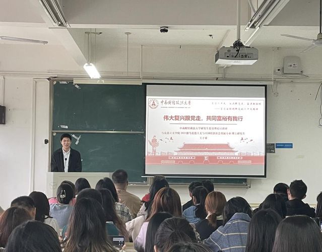 (通讯员 李金亭 摄影 陈婵)为深入学习宣传贯彻党的二十大精神,推动大会精神入脑入心,11月13日上午,校研究生党员理论宣讲团成员王子秦同志在文添楼301室开展“伟大复兴跟党走,共同富裕有我行”主题党课宣讲活动。本次活动由马克思主义学院研究生第二党支部书记李圣楠主持,马克思主义学院研究生第二党支部以及法学院研究生2021级第三党支部的全体党员和积极分子参与本次活动。