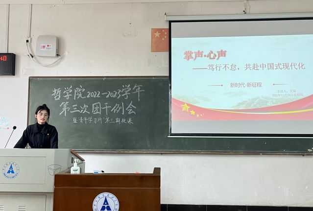 (通讯员、摄影 彭卓曦)为鼓励青年团员深入学习党的二十大精神,马克思主义学院青年学习社于11月24日下午在文澜楼109教室参加哲学院2022-2023学年第三次团干例会暨“青年学习所”第三期授课活动。马克思主义学院青年学习社社员吴菊作为主讲人展开了以“掌声·心声——笃行不怠,共赴中国式现代化”为主题的理论授课。