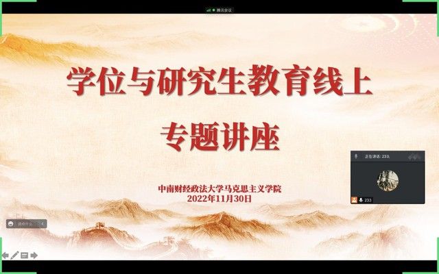 为进一步提高研究生教学质量,马克思主义学院于11月30日在线上召开学位与研究生教育专题讲座。本次线上专题讲座特邀钟涛编辑为主讲人,学院副院长荣枢、李世黎,各学科群负责人、博士生导师和硕士生导师参会。