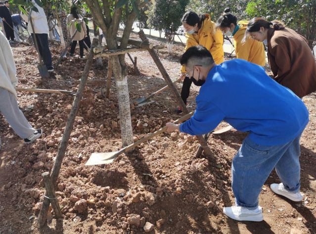 活动伊始,学校园林职工向大家详细讲解了植树的方法和标准,在认真听完相关注意事项后,同学们热情高涨,立即投入到热火朝天的植树活动中。师生代表三五人一组,分工协作,默契配合,干劲十足,大家纷纷挽起衣袖、拿起铁锹、挥锹铲土、夯实土层、培土围堰……认真做好每一道工序,四处都是忙碌的身影,植树现场呈现出一派繁忙的劳动景象。经过师生代表的辛勤劳作,几十棵树苗稳稳的扎根在友谊林上,在和煦的春风中焕发着勃勃生机,为春天的中南大添绿增彩。