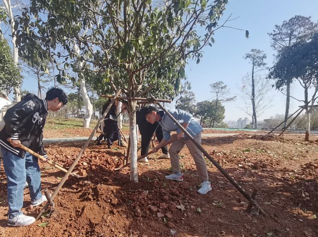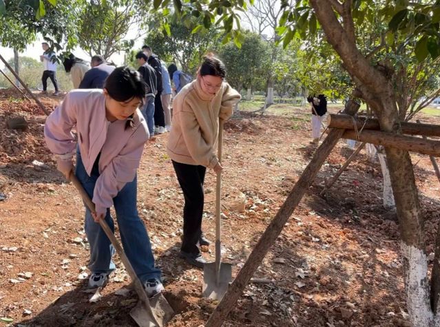 活动伊始,同学们认真听取并学习了学校园林职工关于植树方法、标准的讲解。在了解完相关注意事项后,同学们热情高涨,立即投入到植树活动中。活动中,同学们纷纷拿起铁锹,迎着初升朝阳、踏着中南沃土,以三五人为一组,扶树填土、踏实修整、培土围堰。大家团结协作、默契配合、紧密衔接,活动现场呈现出一片热闹繁忙的劳动景象。经过辛勤劳作,马克思主义学院22级共青团员共种下树木20余棵,以实际行动扮靓春天的中南大。