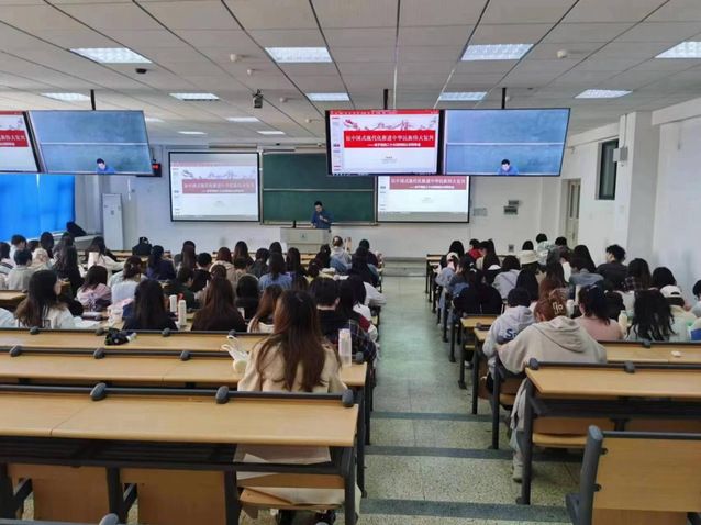 马克思主义学院高晓溪老师围绕“中国式现代化的历史与逻辑”这一主题,从中国式现代化的历史进程、重要特征和本质要求等方面,梳理了中国共产党带领人民艰辛探索中国式现代化的历史,阐述了中国式现代化是人口规模巨大的现代化等五大重要特征,以及坚持中国共产党领导等本质要求,并就“中国式现代化”和“中国的现代化”等概念作了辨析。他还以“正确理解共同富裕的本质内涵”为题,讲授了共同富裕的内涵、推进共同富裕的原因以及实现共同富裕的路径。