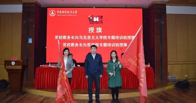 党校教务长向前分别向马克思主义学院、哲学院专题培训班授旗,马克思主义学院党委书记邓杨、哲学院党委副书记徐江接旗。