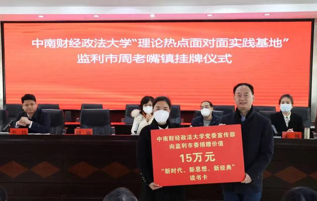 ▲校党委常委、党委宣传部部长兼马克思主义学院院长周巍代表学校向监利市捐赠价值15万元的“新时代、新思想、新经典”读书卡,监利市委宣传部常务副部长王利伶接卡。