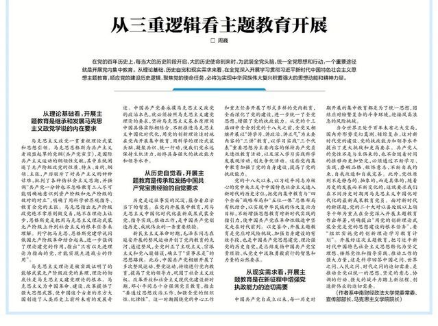 今日,《湖北日报》理论版“论丛”专版刊发校党委常委、党委宣传部部长兼马克思主义学院院长周巍主题教育理论文章《从三重逻辑看主题教育开展》