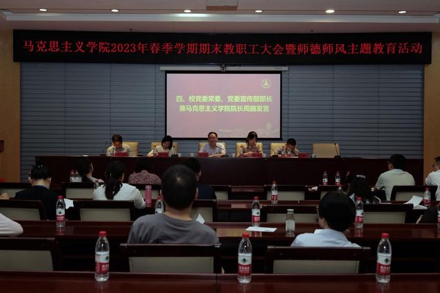 (通讯员 金慧婷)2023年6月15日下午,马克思主义学院于中原楼7楼会议室召开全院教职工大会,校党委常委、党委宣传部部长兼马克思主义学院院长周巍作总结讲话,院党委书记邓杨主持会议,学院领导班子及全体教职工参会。