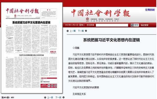 今日,《中国社会科学报》头版头条“真理之光”专栏刊发校党委常委、党委宣传部部长兼马克思主义学院院长周巍理论文章《系统把握习近平文化思想内在逻辑》,文章从习近平文化思想的构成要素、结构层次和鲜明特征等方面进行阐释。