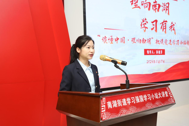 “学习强国”学习小站首批领学员、我校外国语学院2022级硕士研究生党员孙逸芳以“理响南湖、学习有我”为题进行了领学,带领大家共同学习了习近平总书记2020年9月在基层代表座谈会上的重要讲话,“以前我们主要面对学生,这是我第一次走进社区作宣讲。能把自己所学转化成居民感兴趣的理论知识,为基层党组织建设出力,我感到很荣幸。”
