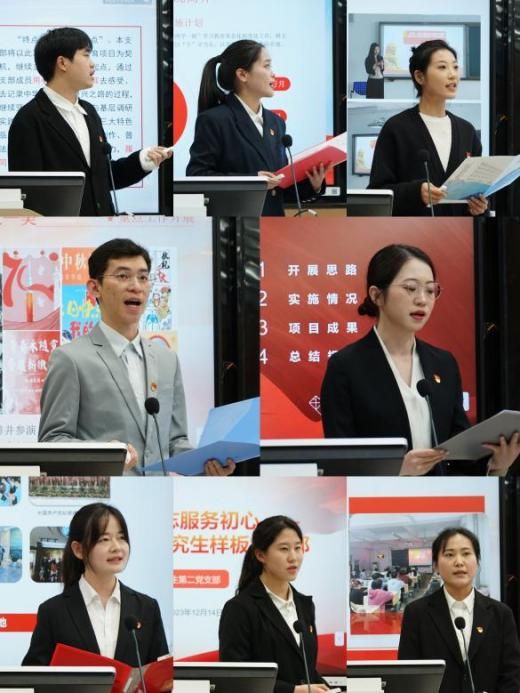 在展示汇报环节,学院研究生第一党支部书记高金萍从“与理论武装联动,听党话跟党走,增强支部引领力”“与专业学习联动,学马讲马研马,激发党员创新力”“与社会实践联动,践行青年担当,提升支部战斗力”“与教工支部联动,同学共建互促,凝聚支部新合力”四个方面汇报支部打造“四联四力”研究生党支部建设新模式的成效。参加本次展评的16个研究生党支部以学习贯彻党的二十大精神为主线,紧紧围绕党支部“七个有力”的建设要求,用生动的语言、饱满的热情和丰富的素材呈现了各党支部建设的经验成效。